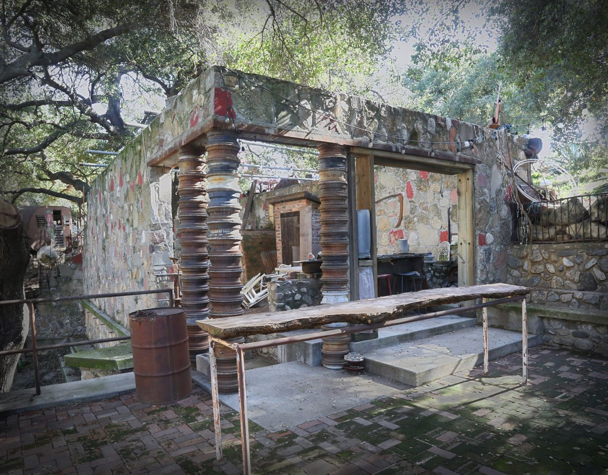The ranch was the creation of Jirayr Zorthian, an Armenian-American artist who arrived in Pasadena after studying painting and mural work at Yale. In the 1940s, he purchased acreage in the San Gabriel foothills and turned it into his living masterpiece. Zorthian constructed whimsical towers from stone and scrap, painted satirical murals, and filled the land with sculptures and murals that mixed classical themes with comic irreverence.