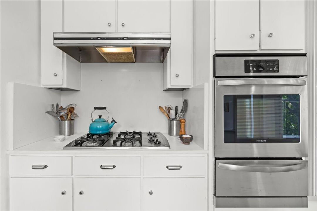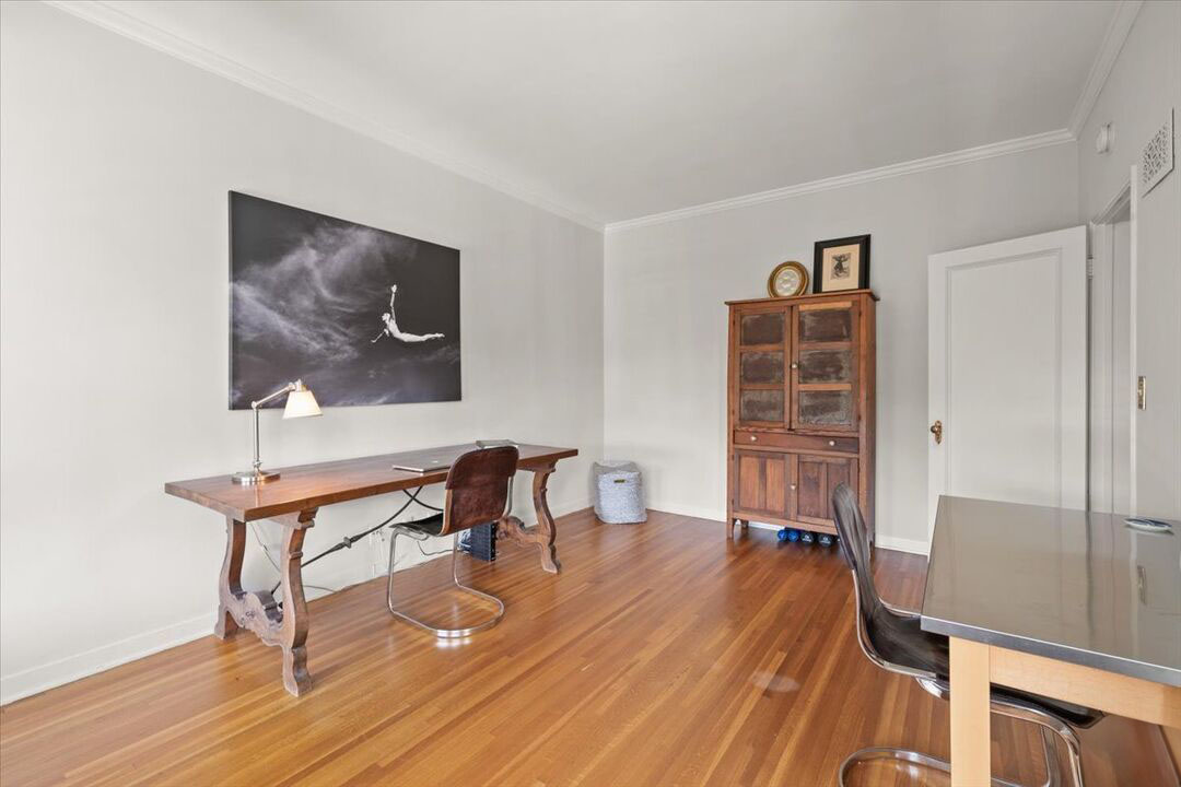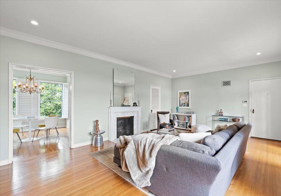 This second-floor Pasadena French Normandy on Grand welcomes you with 9-foot ceilings, rich hardwood flooring, and abundant natural light streaming through French doors and windows. The oversized living room is the perfect centerpiece, featuring a decorative marble fireplace and a south-facing balcony overlooking the pool, spa, and treetops. The formal dining room flows seamlessly into a sunny kitchen with built-in oven, gas range, stainless steel refrigerator, and full-size washer and dryer.
