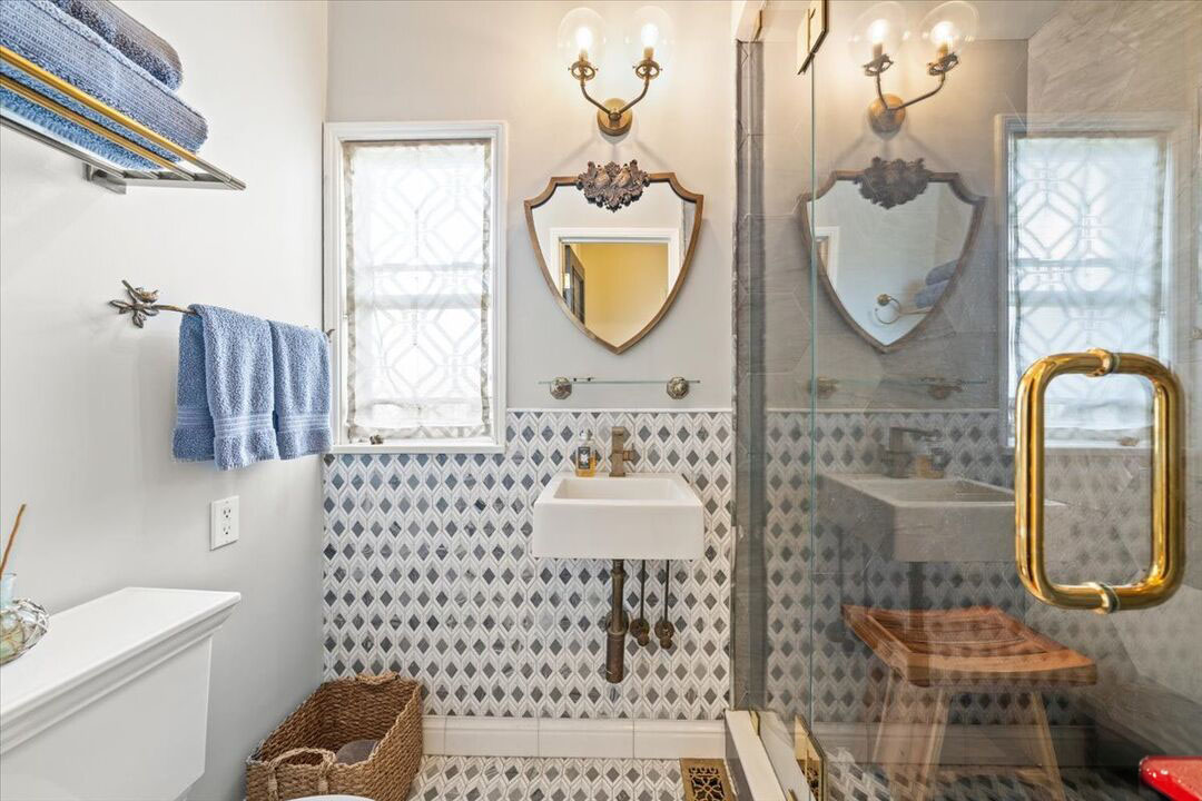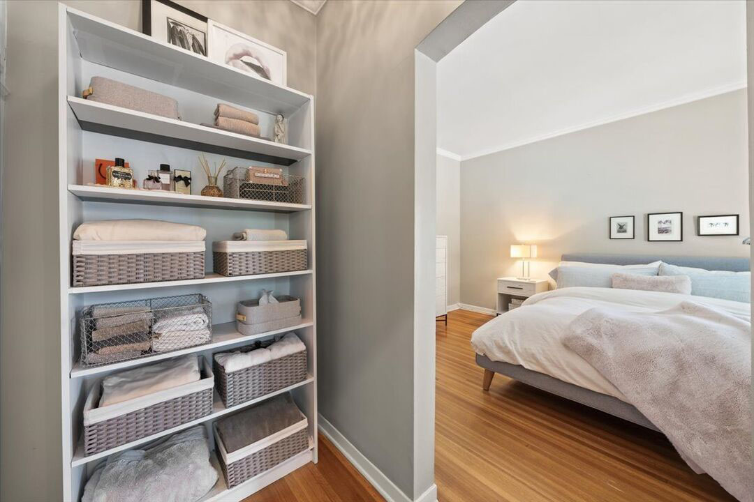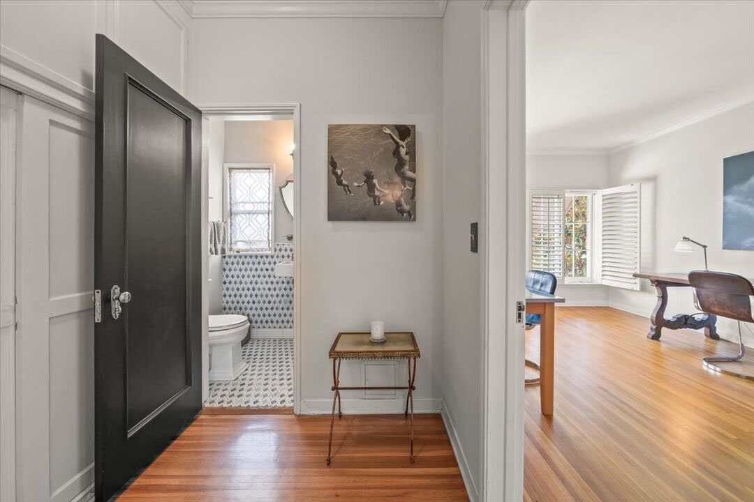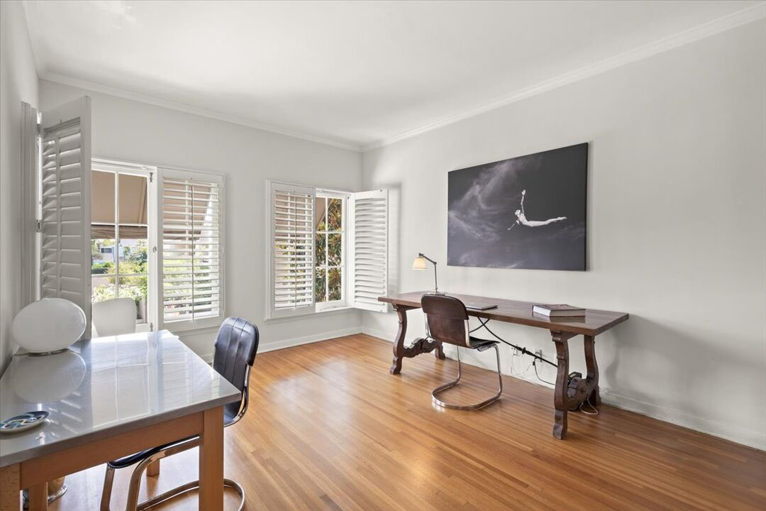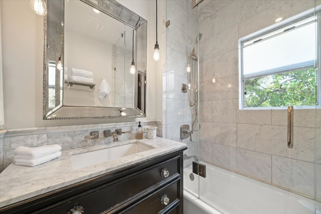 Each of the two bedrooms offers a retreat-like feel with en suite bathrooms remodeled in timeless sophistication. Steam showers, Italian marble, artisan tile, and Brizo fixtures elevate the space, while custom closet interiors add thoughtful convenience. Every corner of this Pasadena French Normandy on Grand has been designed with style and comfort in mind.