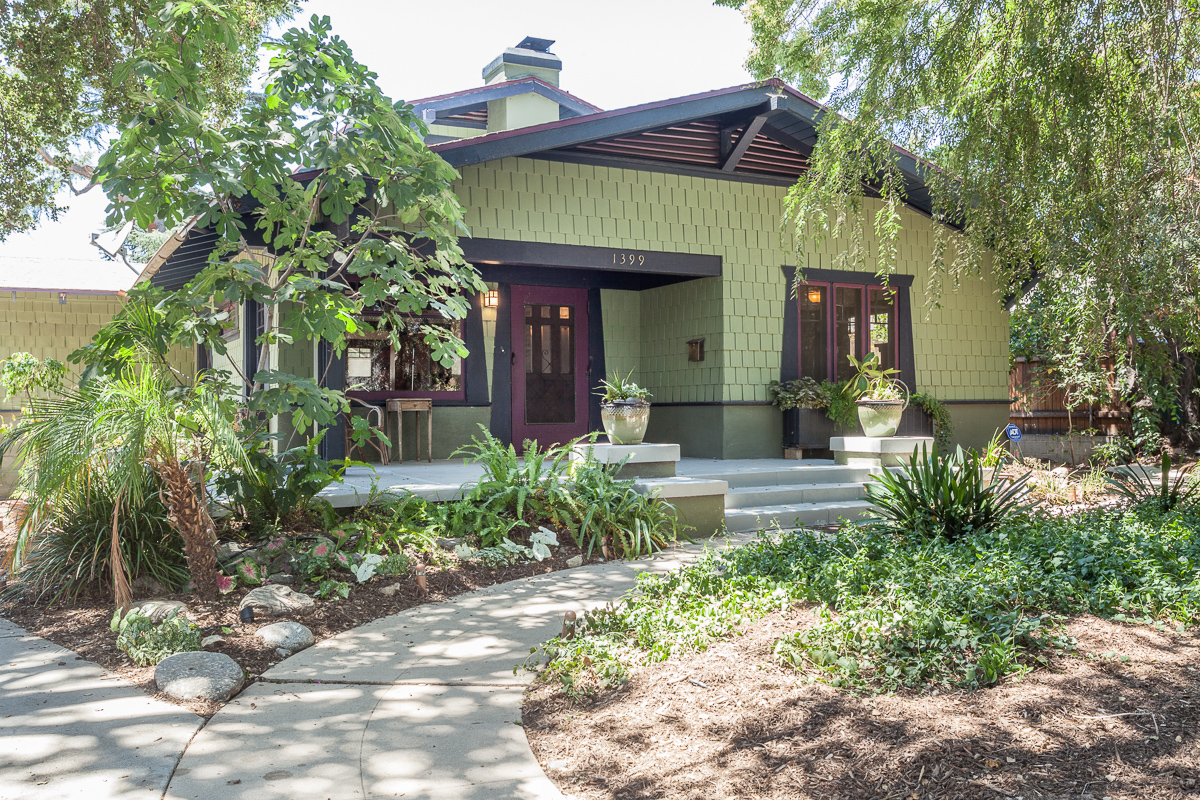 Nestled on a quiet, tree-lined street in Pasadena, this 1913 Craftsman airplane bungalow captures the timeless charm and architectural elegance of its era. Set far back on a shaded lot, the home greets you with a spacious front porch supported by columns, designed for unobstructed views. Classic Craftsman details abound, including exposed rafter tails, roof beams, a front gable low-pitched roof, and distinctive shingle siding.