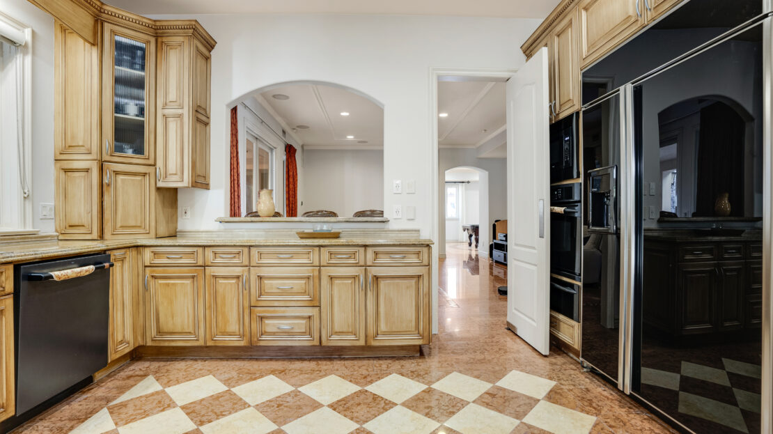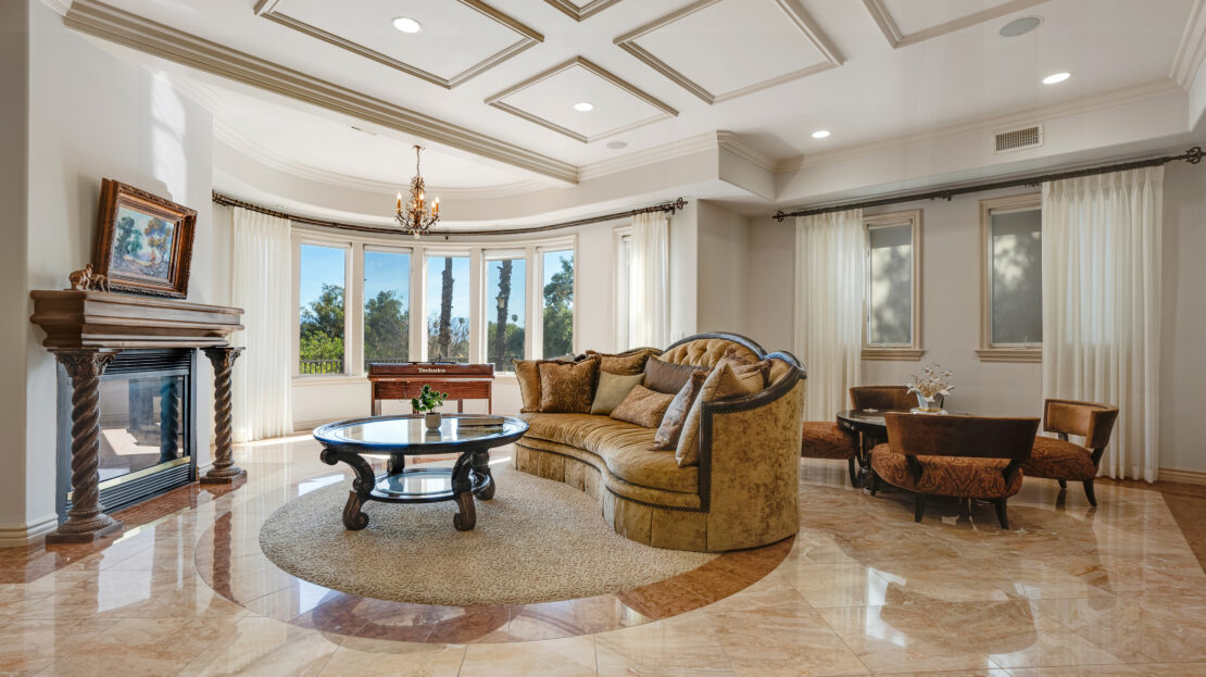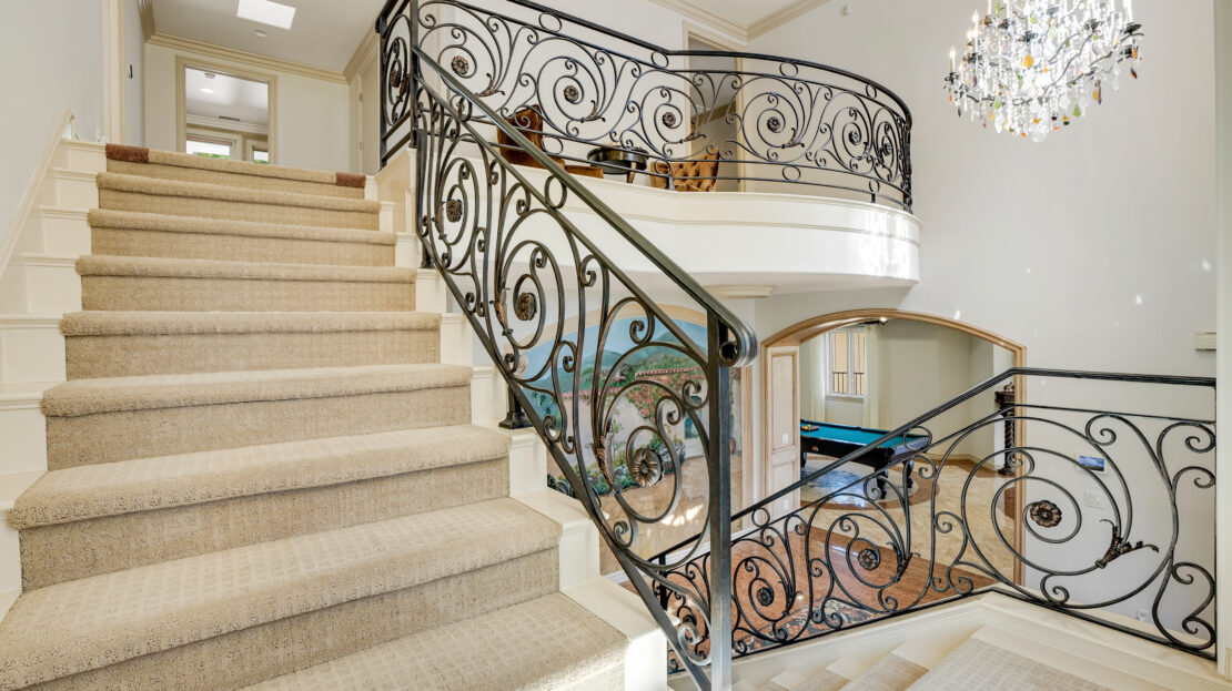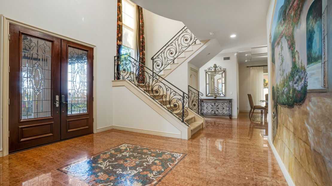 Inside, the home reveals its scale and craftsmanship. A dramatic two-story foyer features hand-painted murals and intricate mosaic flooring, setting the tone for the rest of the residence.